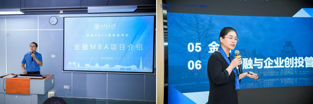 经济与金融学院MBA中心主任马草原教授与副主任刘泓汛教授分别为MBA(数字金融与企业创投管理方向)和MBA(金融方向)的新生进行了项目全面解读。他们详细介绍了金融MBA的培养体系、课程特色及项目优势,展示了紧跟前沿的校企合作课程、高水准的实践基地平台、专业的校内外导师队伍,以及创新的“双导师+三课堂”培养模式,让新生们对即将开始的学习之旅充满期待与向往。