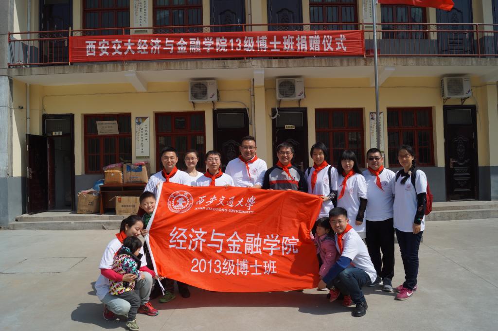 在西安交通大学双甲子校庆前夕,经济与金融学院13级博士班部分代表同学于3月19日,自行驱车前往蓝田县灞源镇万军廻小学献爱心。该活动通过蓝田县县委、县教育局向在校全部的27名小学生及其他贫困教学点的学生捐献100套书包文具。同时在现场募集部分现金用于改善万军廻教学点的教学设施。