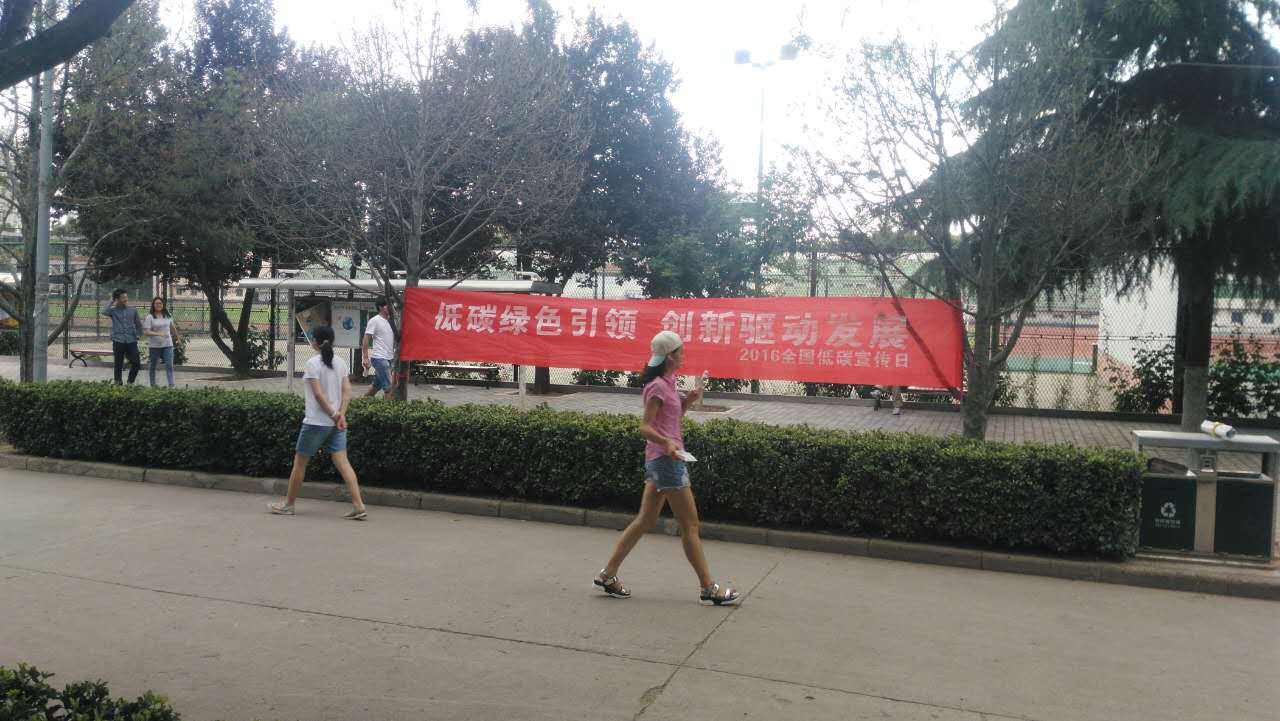 紧密联系2016年“全国低碳日”的宣传主旨,突出低碳校园创建特色,设计并制作了“全国低碳日”宣传横幅。横幅的内容分别为“树立绿色理念,建设低碳校园” 、“低碳绿色引领,创新驱动发展” ,并在校园主人行道、教学主楼前悬挂,以引起师生注意。