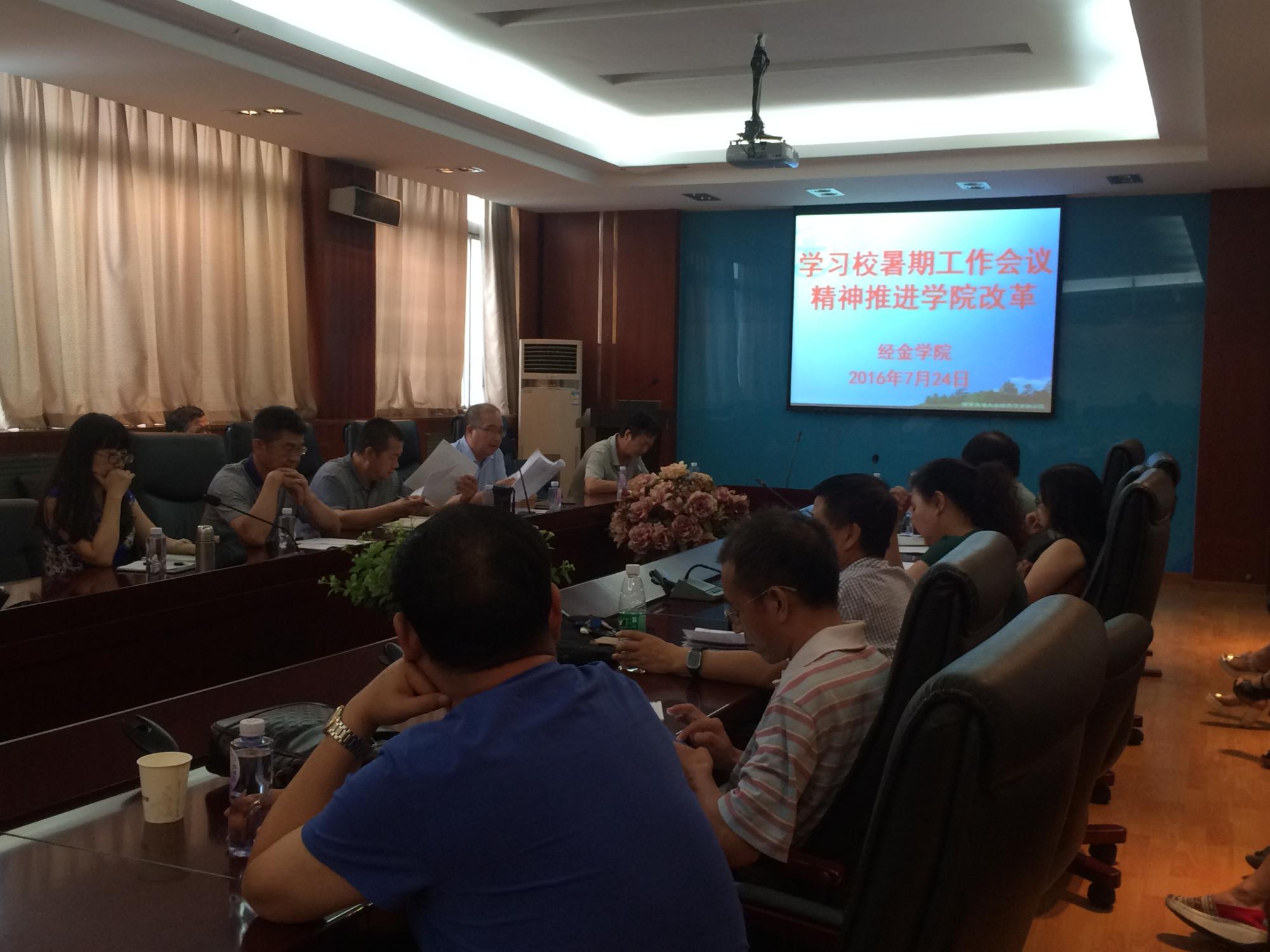 7月24日下午,经金学院召开学院干部教工大会,传达学习校暑期会议精神,对照学校2016年工作要点和学院工作计划,深入研讨学院下一步工作,全面推进学院改革。学院领导、院长助理,系主任、系书记,系主任助理和全体行政人员参加会议。