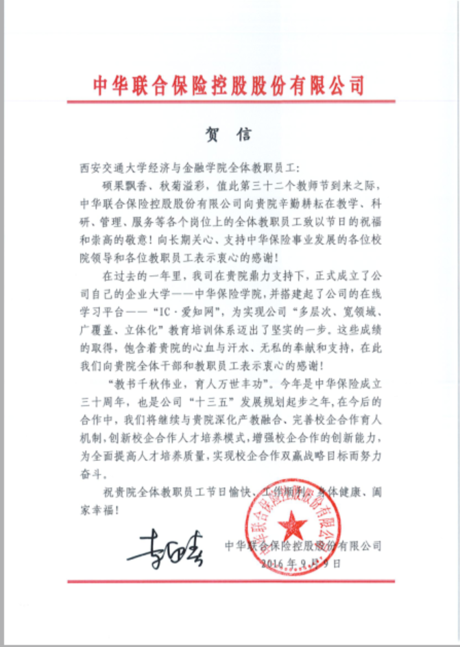 中华联合保险控股股份有限公司致学院教师节贺信