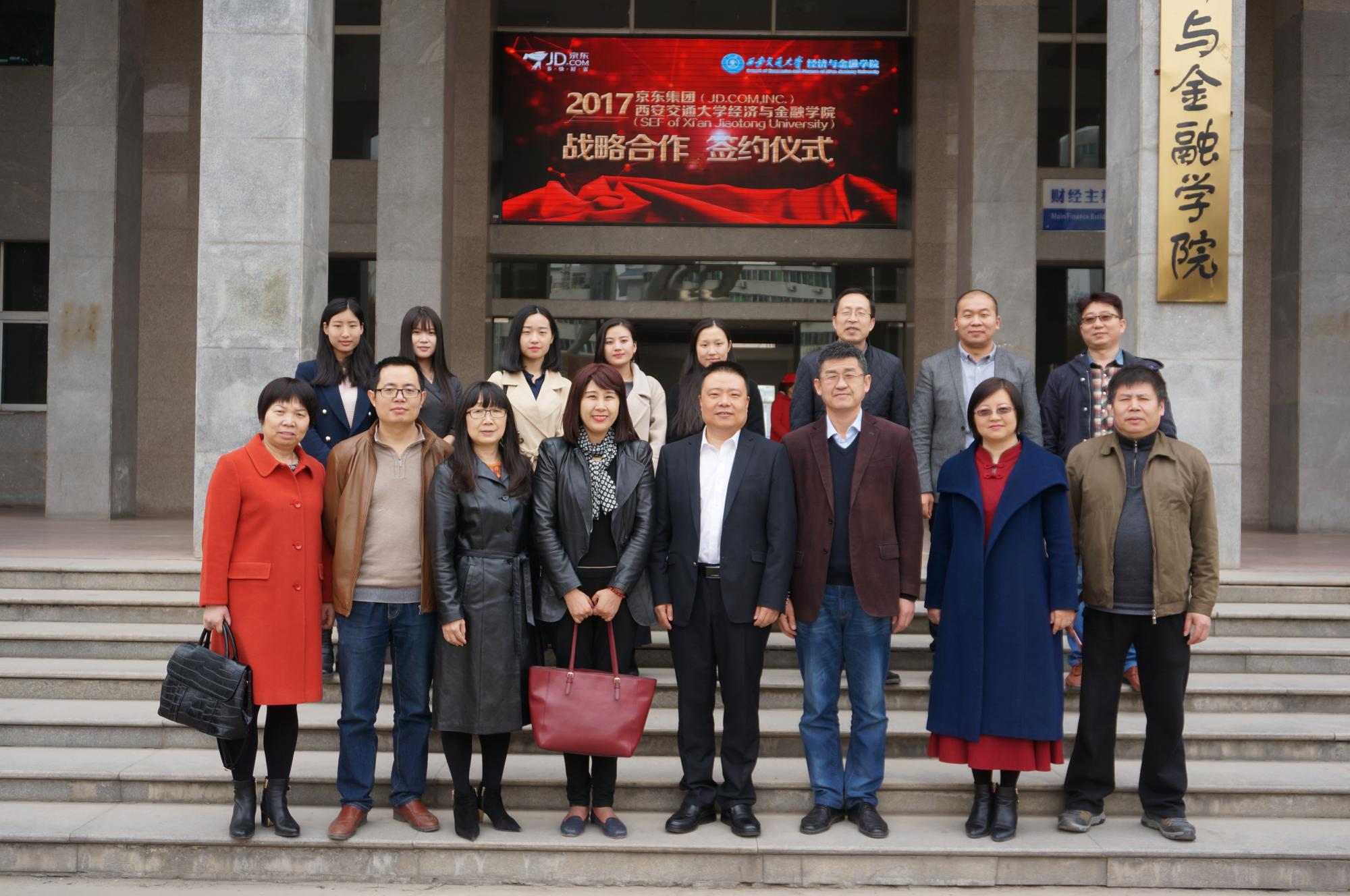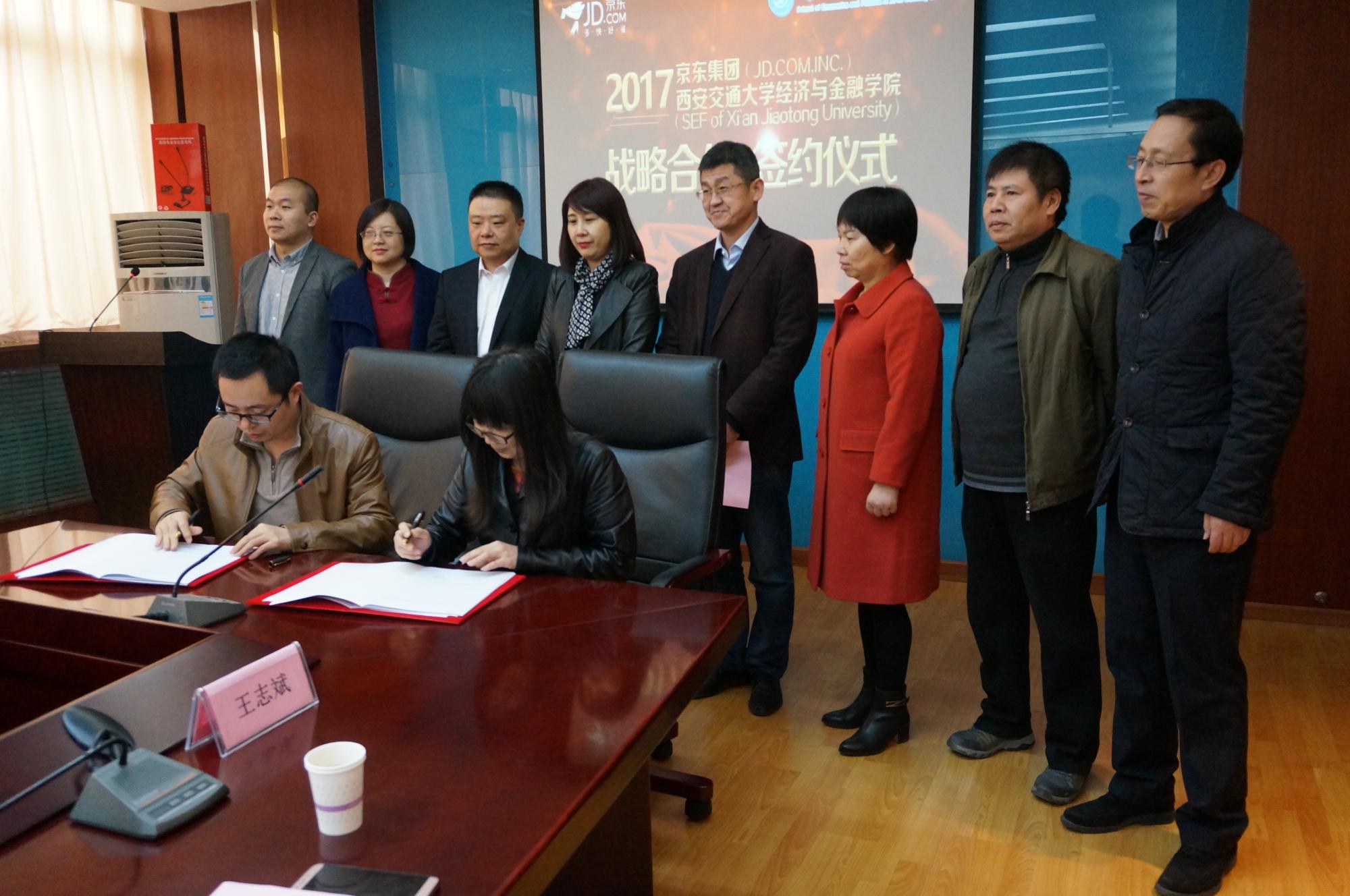 2017年3月10日下午两点,京东集团和西安交大经金学院战略合作协议签约仪式成功举办。出席签约仪式的有京东集团副总裁、京东西北公司总经理吕文凯,京东西北公司人力资源部总监吴从杰,京东集团商学院负责人施蕾,京东集团公关部西北区总监郭晓蓉,京东西北公司公共事务部总监郑刚,京东西北公司人力资源部经理张丹竹,京东西北公司总经理助理郭龙华,京东西北公司公共事务部经理王馨苑。西安交通大学社科处处长贾毅华,西安交大经金学院院长孙早、党委书记宋丽颖、院长助理袁晓玲、电子商务系主任魏修建、电子商务系党支部书记应喆,校友办主任王志斌等参加签约仪式。