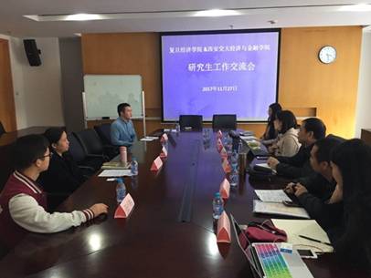 27日下午,经金学院师生代表团与复旦大学经济学院研工办袁莉莉老师、负责就业指导的江源老师以及研究生会主要负责同学就研究生工作展开了沟通交流。袁莉莉老师、江源老师对西安交通大学经金学院师生代表团的到来表示热烈欢迎。袁莉莉老师对复旦大学经济学院研究生工作队伍的组成、硕、博士生管理体制进行详细介绍,江源老师对复旦大学经济学院就业指导工作的开展以及硕、博士生就业情况进行了详细的阐述。研究生会郝建超同学介绍了复旦大学经济学院研究生会的组织架构、各个职能部门开展的活动以及工作创新。王平老师代表经金学院对复旦大学经济学院的热情接待表示感谢。王平老师肯定了复旦大学经济学院在研究生管理体制中的奖惩机制。双方一致表示,希望加强双方之间的交流合作,更好的为学生提供学业以及就业指导方面的服务。