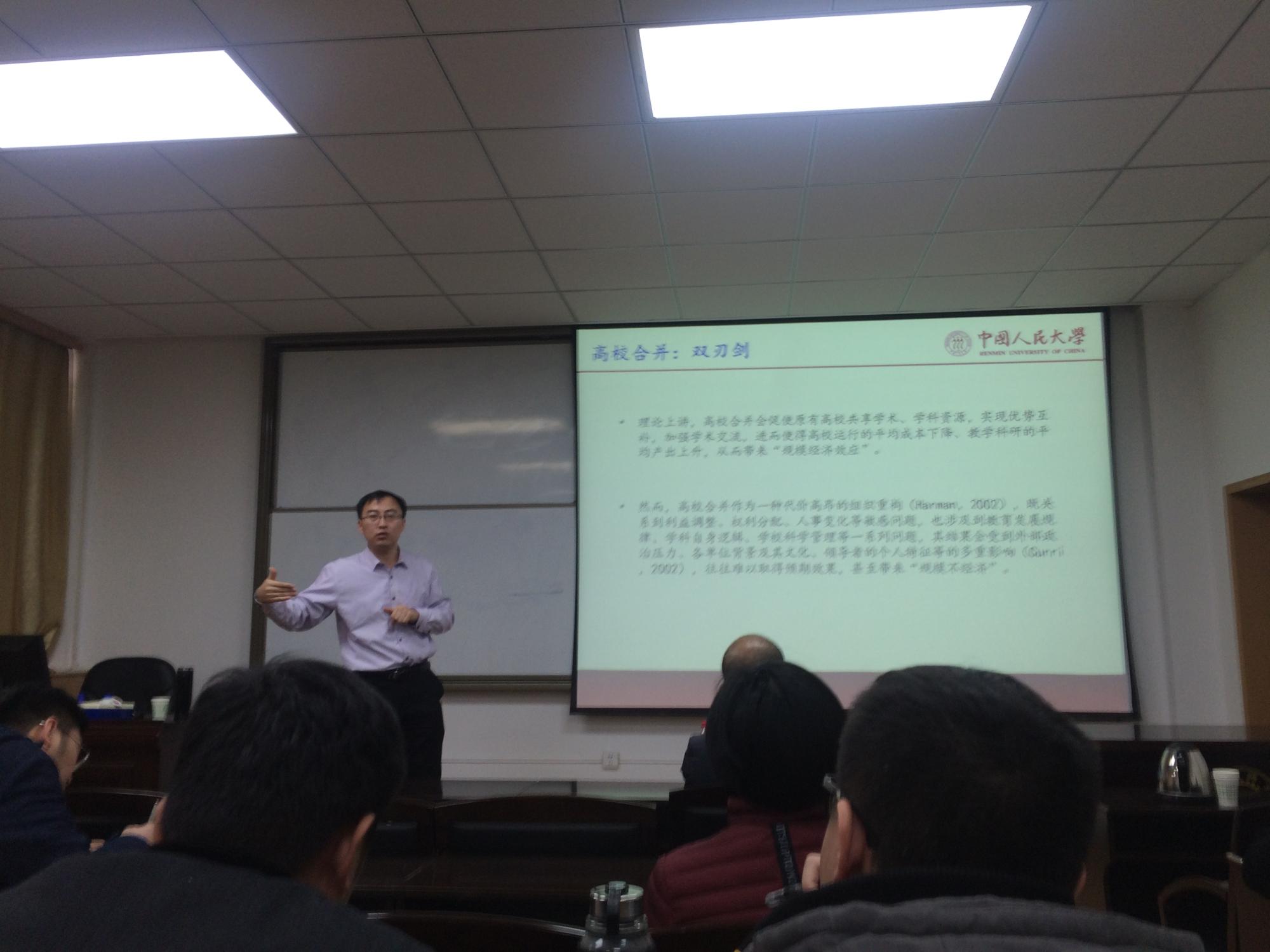 刘瑞明副教授报告的题目为《高校合并促进了科研绩效提升吗?——基于双重差分方法的验证》。讲座首先介绍了我国高校合并的历史背景,指出我国高校合并在组织构成、社会定位、以及合并的具体方式和过程方面都有自己独特的运行逻辑,高校合并非但不是文化矛盾的安置地,反而是文化冲突的制造厂,我国高校的合并不仅难以达到预期结果,甚至存在“规模不经济”现象。其次在对数据选择与变量设定进行阐述后,基于双重差分方法就高校合并的科研绩效进行评估并对高校合并的异质性效应进行了检验,结果证实高校合并阻碍了高校科研水平的提高。报告指出如果既有的体制运行障碍不能有效破除,那么,新一轮高校合并就难免重蹈覆辙。在讲座的最后阶段,刘瑞明副教授还与师生们进行了极为热烈地互动交流,回答了与会师生提出的诸如数据选取、机制研究、计量模型设定以及稳健性检验等各种问题。随后,温军教授点评了报告,并欢迎刘瑞明博士以后常来学院进行学术交流,深入扩大西安交通大学与中国人民大学的合作。