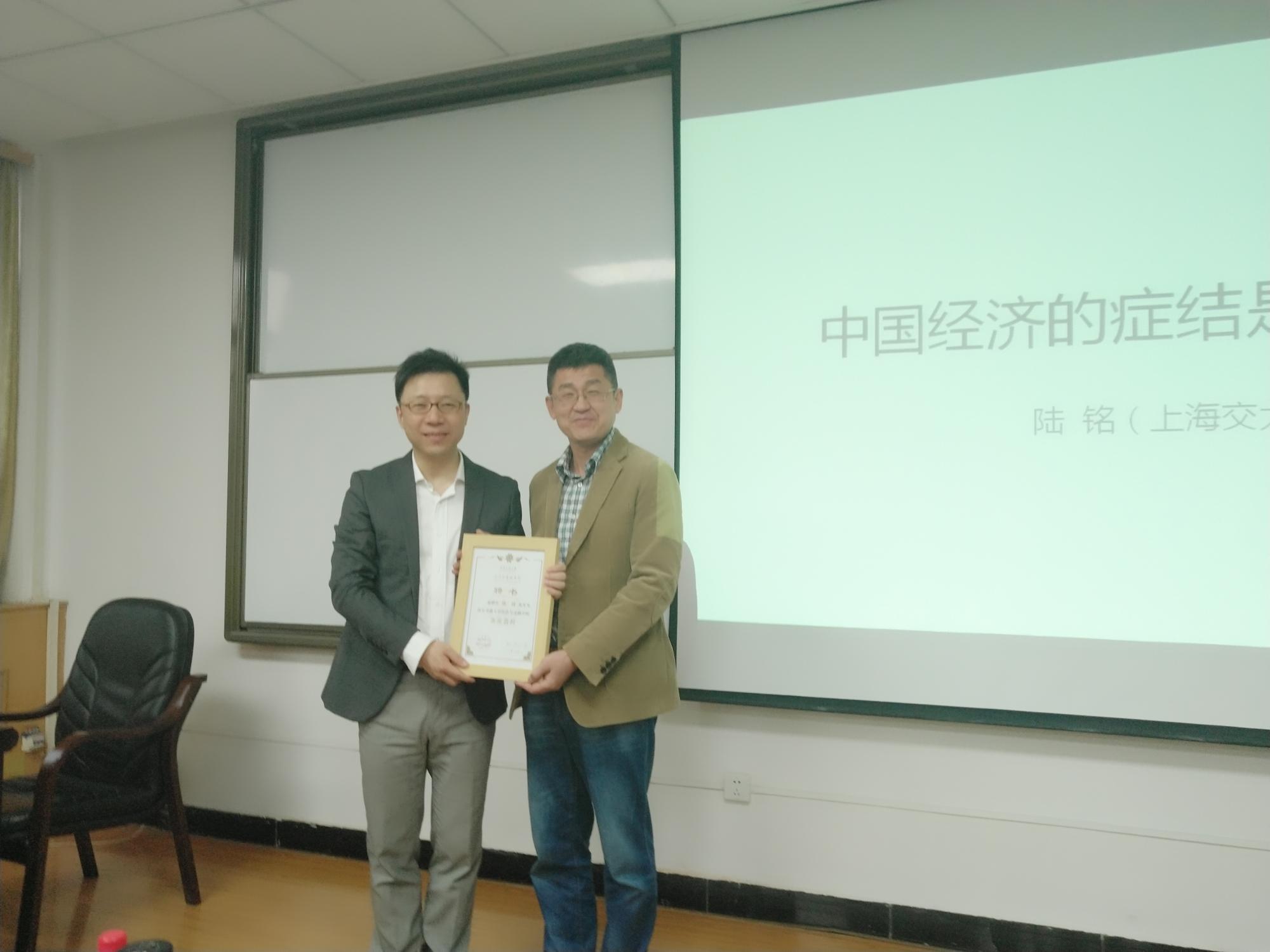 2018年4月9日晚上, 陆铭教授为经金学院师生做了迎校庆专题学术讲座。讲座由经金学院院长孙早教授主持,经金学院近100多人参加了讲座,整个会场座无虚席。讲座之前,孙早教授为陆铭教授颁发了客座教授证书,陆铭教授表示今后一定要为经金学院的学科建设和学术合作贡献自己的力量。