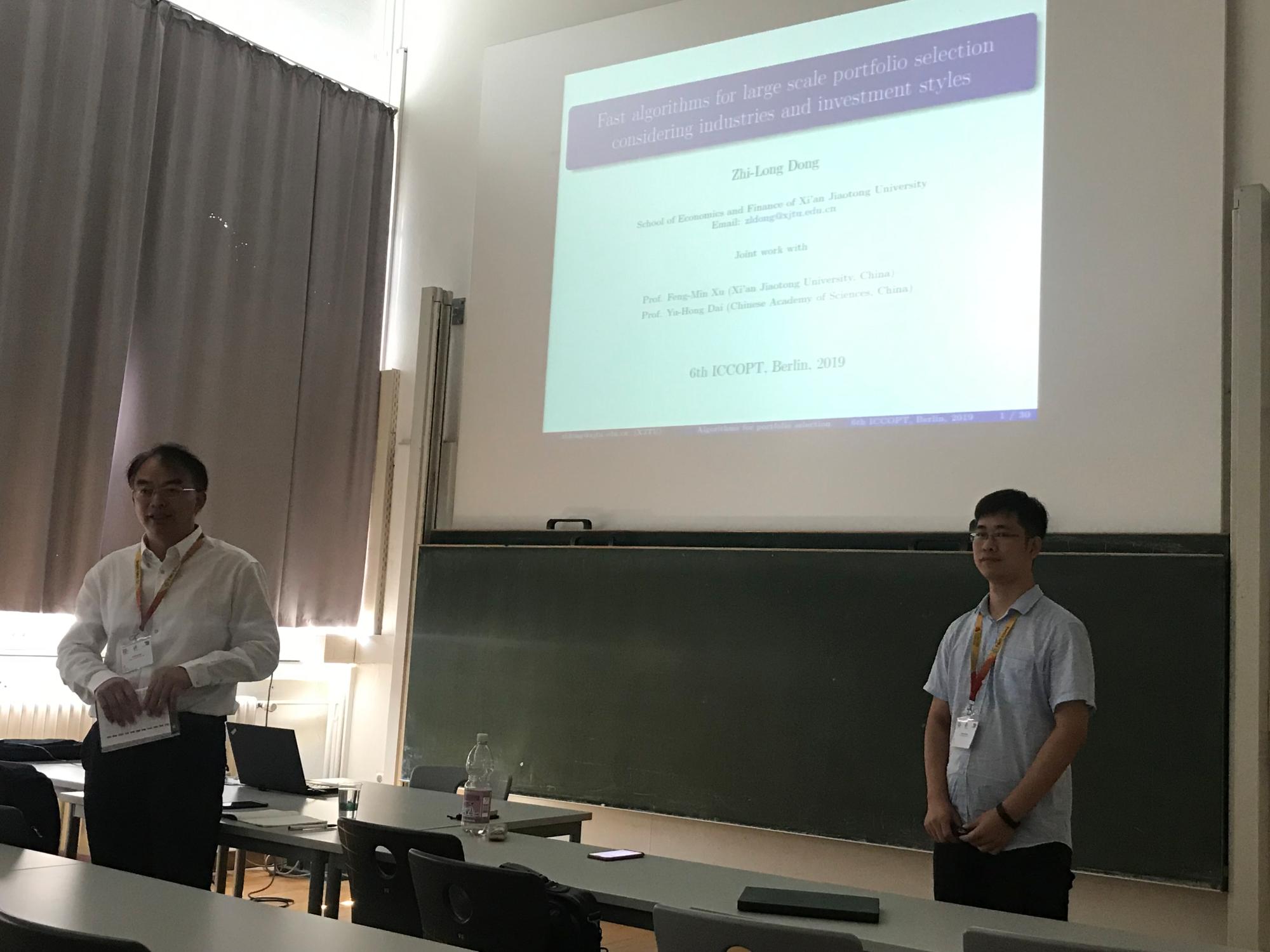 2019年8月3日至8日,西安交通大学经金学院徐凤敏教授与青年教师董志龙受邀参加在德国柏林举行的第六届国际连续优化大会(ICCOPT2019),徐凤敏教授组织并主持了主题为“随机优化及其应用”的分组报告,会上徐凤敏教授与董志龙分别就最优化方法在金融投资组合调整以及稀疏投资组合问题中的应用进行了报告。ICCOPT是国际数学优化学会(Mathematical Optimization Society)举办的旗舰会议,每三年举办一次。这一国际会议在数学优化领域有非常重要的影响,今年吸引了来自70多个国家的1000多名学者参会。