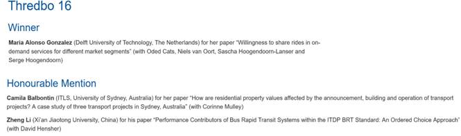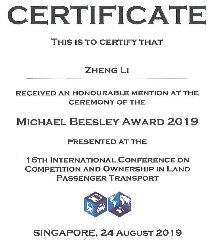 近日,第16届陆运竞争与所有权国际会议16thInternational Conference on Competition and Ownership in Land Passenger Transport (Thredbo 16)在新加坡召开。该会议吸引了来自全世界30多个国家的交通学者、规划者和政府人员,西安交通大学经金学院青年拔尖人才李铮教授是唯一来自中国大陆的与会者并受邀做了大会第一分会场的开场报告。Thredbo 16会议共录用论文145篇论文,李铮教授的论文:‘Performance Contributors of Bus Rapid Transit Systems within the ITDP BRT Standard: An Ordered Choice Approach’获得最佳论文奖(The Michael Beesley Award)的第二名(并列)。