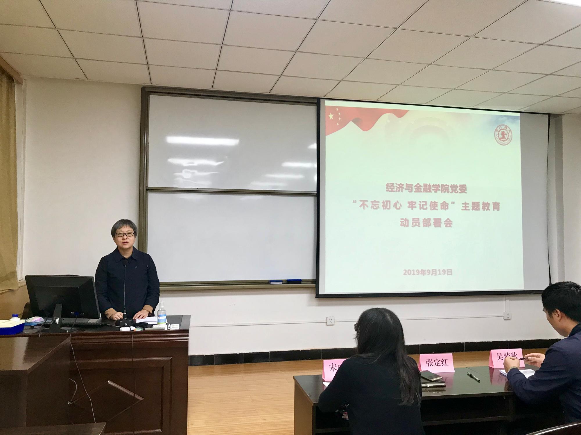 9月19日下午,经济与金融学院党委在财经主楼802报告厅召开“不忘初心、牢记使命”主题教育动员部署会。学院领导班子、教工党员、学生党员代表共计70余人参加会议。主题教育第十指导组联系常委张定红、成员吴孟秋、罗娴出席会议。会议由宋丽颖书记主持。