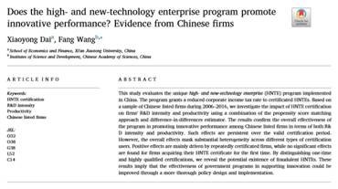近日,经济与金融学院副教授戴小勇在国际SSCI权威期刊《China Economic Review》发表了题为《Does the high- and new-technology enterprise program promote innovative performance? Evidence from Chinese firms》的学术论文。