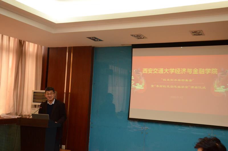 2020年1月12日上午,西安交大经济与金融学院2019年度“校友剑冰奖励基金”暨“暨粤财校友励志奖学金”颁奖仪式在财经校区教学楼国际交流厅举办。阳光控股执行董事、阳光城执行副总裁、“校友剑冰奖励基金”设立人吴建斌校友,西安交大广东财经校友会会长刁辉波校友,西安交大教育基金会秘书长赵卫滨,西安交大经金学院党委书记宋丽颖、院长孙早、党委副书记周建伦,西安交大宗濂书院院务主任陈阳静,启德书院院务副主任李聪,经金学院团工委书记辅导员王平,宗濂书院辅导员梁俊凤,三位获奖教师及30多名获奖同学参加。周建伦主持颁奖仪式。