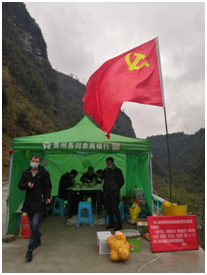 防控点由一顶帐篷简单搭建而成,帐篷里有一张四方木桌,上面铺满了报纸,帐篷旁边放着疫情防控检查点临时党支部宣誓的展板,内容是:“生命重于泰山,疫情就是命令,防控就是责任,面对疫情:冲锋在前,勇挑重担,坚守岗位,忠诚履职、团结一心、众志成城,坚决打赢新型冠状病毒疫情的防控战”,在帐篷的上方有一面鲜红的党旗在迎风飘扬。