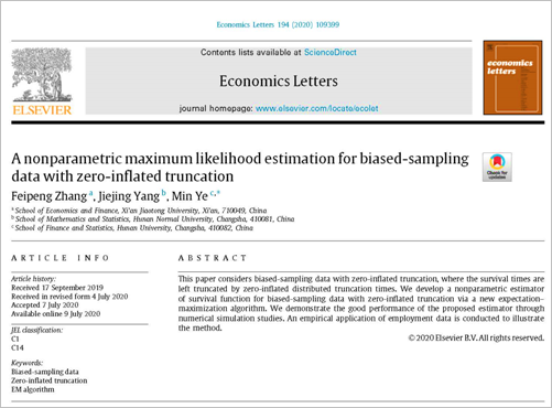 近日,经济与金融学院青年拔尖人才张飞鹏教授作为第一署名作者在国际高水平期刊《EconomicsLetters》的2020年第194卷上发表了题为“A nonparametric maximum likelihood estimation for biased-sampling data with zero-inflated truncation”的学术论文。