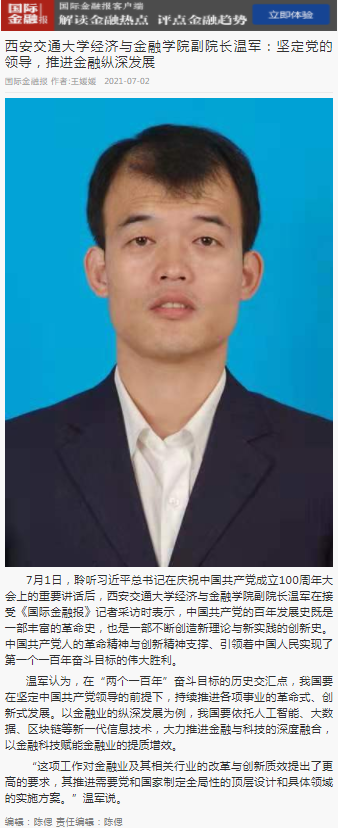 7月1日,聆听习近平总书记在庆祝中国共产党成立100周年大会上的重要讲话后,西安交通大学经济与金融学院副院长温军在接受《国际金融报》记者采访时表示,中国共产党的百年发展史既是一部丰富的革命史,也是一部不断创造新理论与新实践的创新史。中国共产党人的革命精神与创新精神支撑、引领着中国人民实现了第一个一百年奋斗目标的伟大胜利。