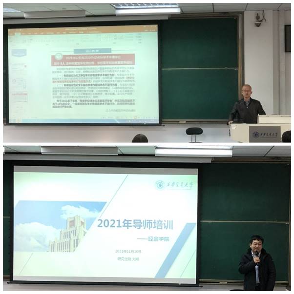 刘明副院长主要针对导师培训工作做了讲话,从学位授予及学位论文情况、质量保障与警示案例、导师队伍管理和下一步工作等四个方面做出了深刻剖析。他指出,经金学院近年来学位论文校级抽检优良率较高,但是仍存在授位率不够高、创新分较低、盲审排名较为靠后等问题。刘明副院长着重向导师们讲解了今年九月份开始实施的《西安交通大学关于进一步加强研究生学位论文质量保障的若干意见(试行)》,从学校职责、学院职责、导师职责、事前监管、事中监督、事后监管、强化制度等方面一一做了详细解释。