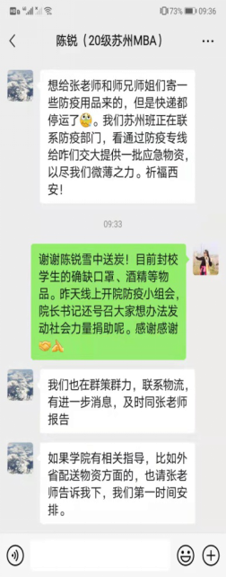 张慧芳、张倩肖等老师表示,多次接到苏州同学慰问,非常欣慰和高兴,深感教师工作的神圣以及育人责任重大!马瑞等同学也表示,收到千里之外学长的抗疫物资,非常激动。交大学子,饮水思源,感恩学长的关心和关怀!2020级MBA(苏州班)同学不但在物质方面支持母校的师生,而且在精神上鼓励大家,同学们赠曰: