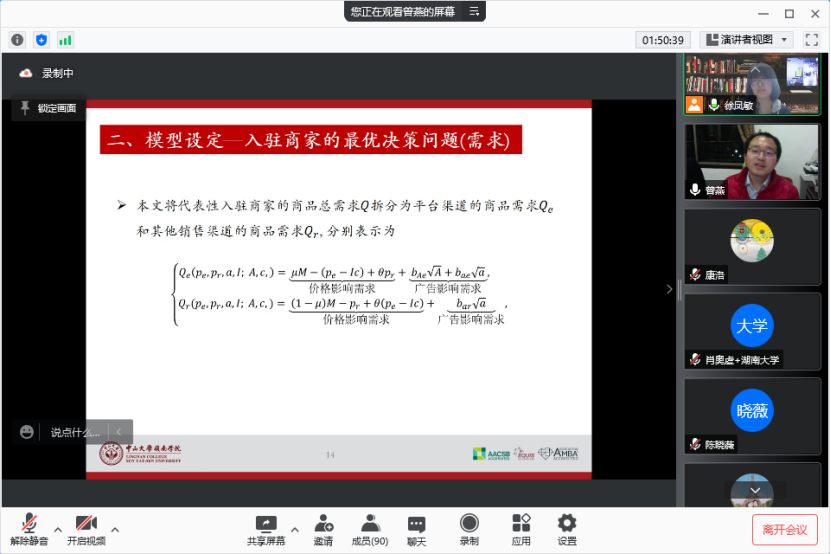 1月11日晚上,学院邀请中山大学岭南学院博士生导师曾燕教授做了主题为“电商平台与其入驻商家合作发放优惠券的最优策略及效益”的报告。曾燕教授从构建理论模型研究了电商平台与其入驻商家合作发放优惠券的最优策略及其经济效益,并考虑了其与传统的广告促销策略之间的相互作用,探讨了发放优惠券的经济效益。1月12日,学院邀请中国人民大学商学院财务与金融学主任、博士生导师许年行教授,从气候变化的角度探讨了气候金融研究的进展。