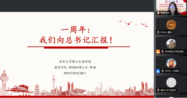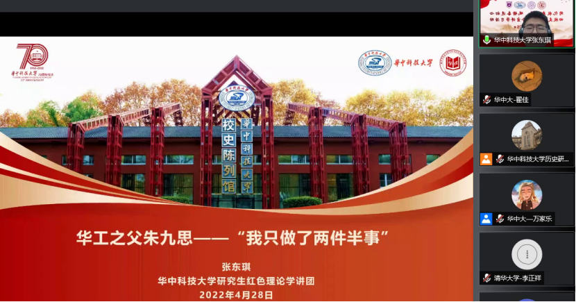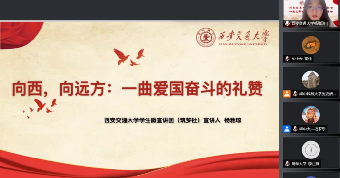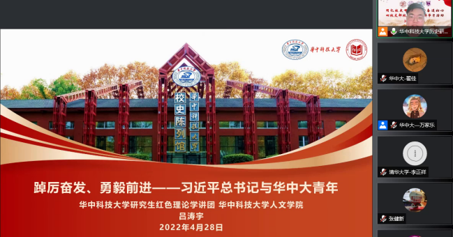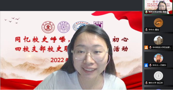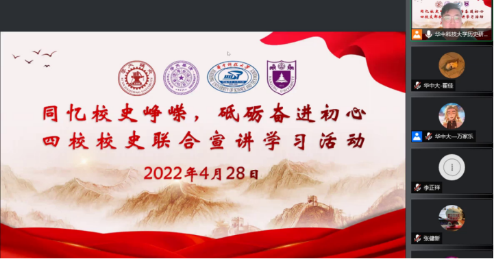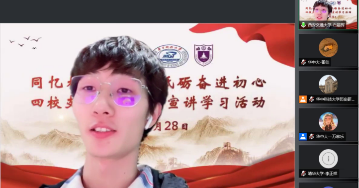 在建团百年、五四青年节即将到来之际,为深入学习习近平总书记25日在中国人民大学考察时的重要讲话精神,用青年话语宣讲各主办高校的校史校情,在重温讲话中砥砺初心,在追忆校史中牢记使命,2022年4月28日晚8点,由西安交通大学经济与金融学院硕0156党支部、华中科技大学人文学院研究生历史专业党支部、南京大学法学院2019级法学硕士第一党支部、以及清华大学建筑学院规景联合党团支部主办的“同忆校史峥嵘,砥砺奋进初心”四校校史联合宣讲学习于线上举行。活动由华中科技大学人文学院研究生历史专业党支部书记吕涛宇同志主持。来自四所学校的百余名青年学生党员线上参加活动。