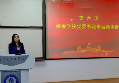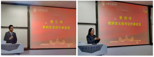 最后,经金学院党委书记宋丽颖做了总结讲话。她说,作为人才培养的重要阵地,院党委将继续深化推进双院育人工作,将党建工作与学院特色、专业优势、育人典型深度融合,多方投入、形成合力,力争取得更大成绩。通过成立新的本科生党支部,促进师生融合共建,有利于教工党支部在助力青年学生成长成才工作中发挥更大力量,有利于促进广大教工特别是教师党员在课堂教学以外,主动走入学生中,以自身的学识、品行带动学生,传播知识和思想、塑造灵魂和生命,营造师生共融、教学相长的良好氛围。她寄语学生党员,要带头做好表率,特别是要积极主动帮助学业困难同学走出困境,主动参加公益活动和社会实践,厚植家国情怀,将个人理想、个人规划、个人奋斗与国家的发展紧密联系,将论文写在祖国大地上,成长为担当民族复兴大任的时代新人。