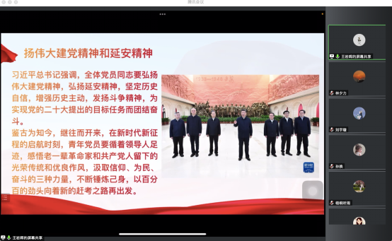 会议第二项,陈莲、翟凯凯同志分享了自己认真学习伟大建党精神和延安精神的心得与感悟。全体党员同志纷纷表示,全面贯彻习近平新时代中国特色社会主义思想,弘扬伟大建党精神,弘扬延安精神,坚定历史自信,增强历史主动,发扬斗争精神,为实现党的二十大提出的目标任务而团结奋斗。