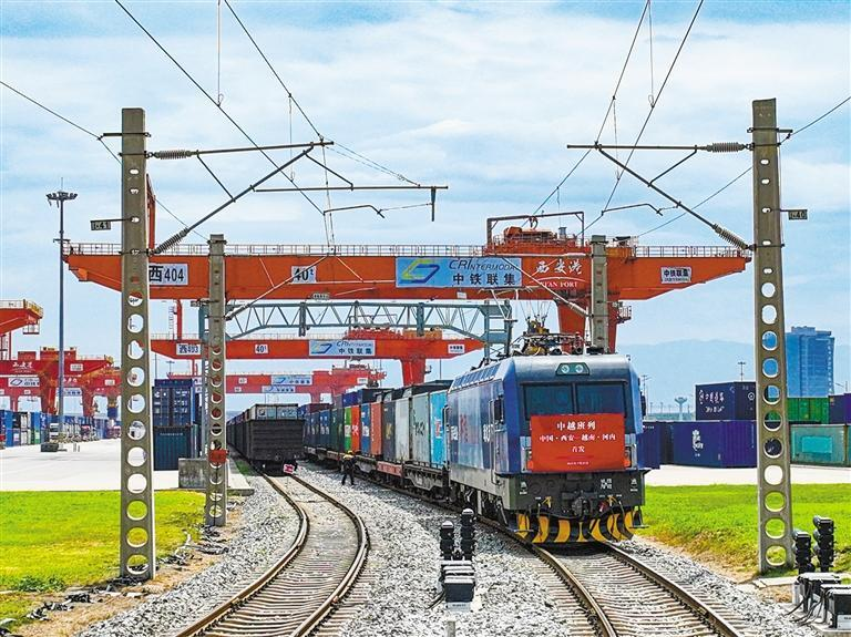 长安号中越国际货运班列(西安—河内)驶出西安国际港站(资料照片)。 本报记者 刘印摄