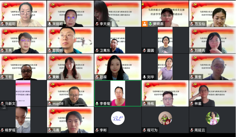 为了进一步深化主题教育的成果,更好地加强专业学院和马克思主义学院的交流,促进学科思政建设和大思政格局的构建。2023年7月24日上午,经济与金融学院财政系党支部和马克思主义学院马原所联合党支部在线上举行经济学学科思政主题共建活动。马克思主义学院党委书记苏玉波、马原所联合党支部、财政系党支部全体党员和教师参加会议,马原所联合党支部书记樊晓燕主持会议。