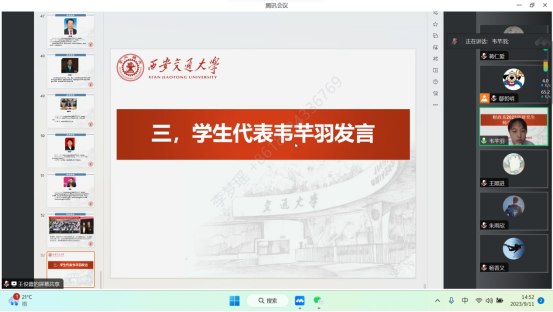 2023级研究生新生代表韦芊羽在会上发言。她表示作为新生来到交大,感到无比的激动与自豪,通过一周的学习和生活,老师的精心授课、浓郁的学习氛围、宽广洁净的校园都给同学们留下了美好印象。在对未来的生活中,她鼓励同学们对自己要有新的要求,要树立更高的人生目标,度过一段有意义的研究生生活,以梦为马,不负韶华。