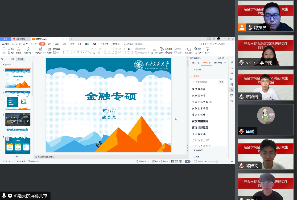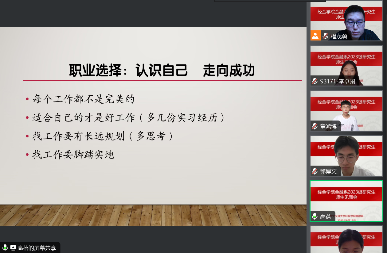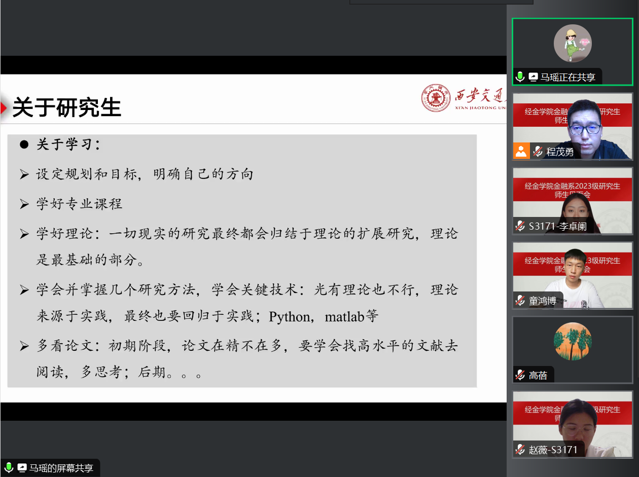 2023年9月17日,金融系举行了2023级研究生网上“师生见面会”。会议由金融系程茂勇老师主持,金融系全体教师和2023级研究生参加了会议。