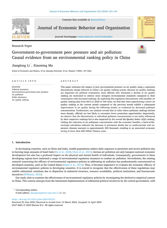 上述研究成果近期以Government-to-Government Peer Pressure and Air Pollution: Causal Evidence from an Environmental Ranking Policy in China为题被行为和组织经济学国际顶级期刊Journal of Economic Behavior & Organization(JEBO)正式接收,李江龙教授为该文第一作者,西安交通大学经济与金融学院为唯一署名单位。JEBO由Elsevier出版社出版,是行为和组织经济学领域公认的顶级学术期刊,致力于发表该领域顶尖水平的理论和实证文章。期刊聚焦经济决策、组织、行为以及经济变革,旨在帮助理解人类认知、数字和信息特征如何影响经济组织和市场经济的运作,以及经济制度演变如何引致各种微观和宏观行为、发展和组织模式的变化。在关注经济决策与行为问题的政策制定者和研究人员中极具声望。