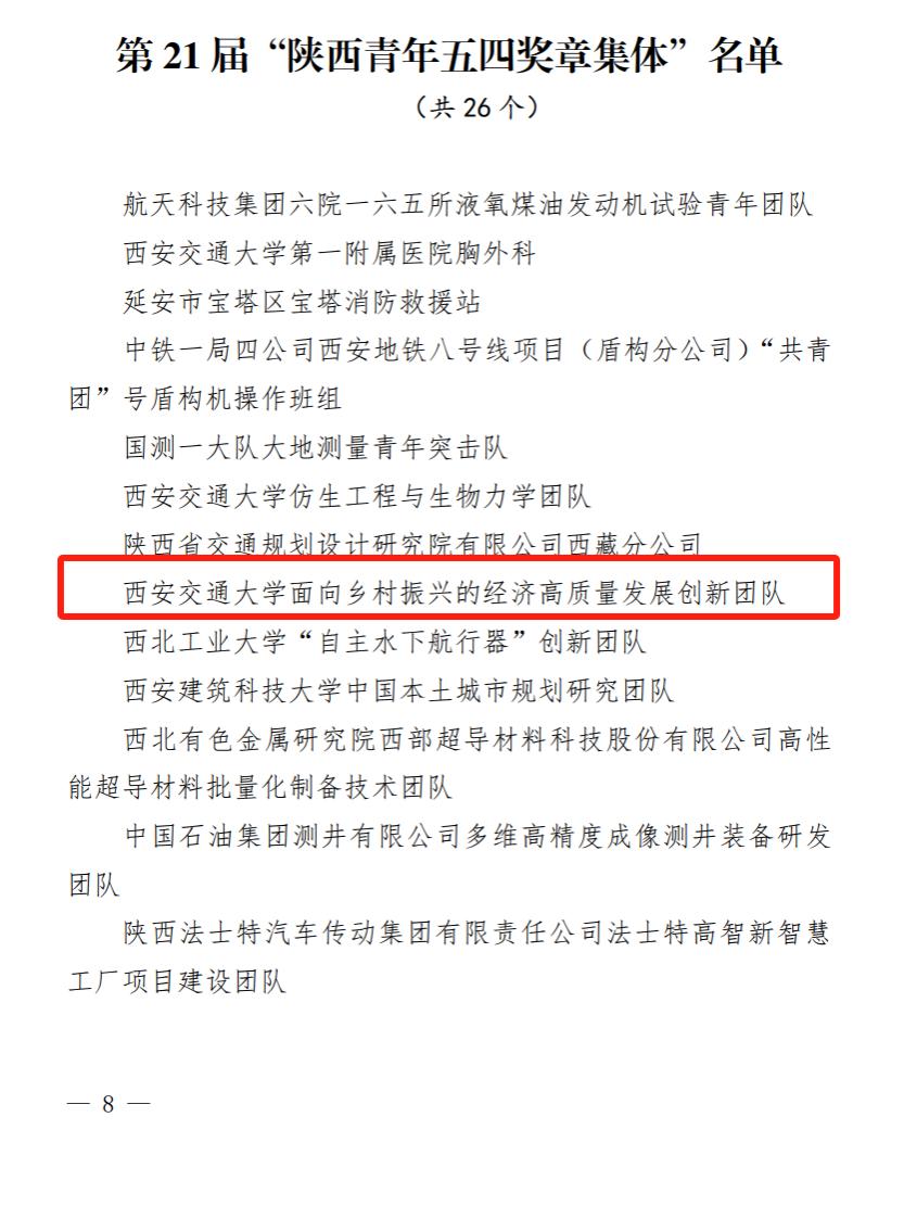 近日,共青团陕西省委、陕西省青年联合会公布关于颁授第21届陕西青年五四奖章的决定。我院李聪教授带领的“西安交通大学面向乡村振兴的经济高质量发展创新团队”获评“陕西青年五四奖章集体”称号。