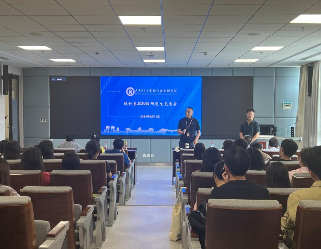2024年9月13日下午,经金学院统计系在创新港校区涵英楼8003教室举行了2024级研究生新生见面会,经金学院副院长赵春艳教授、统计系系主任李聪教授、副系主任林颖副教授、统计学学科带头人严明义教授、统计系全体教职工及学院研究生教务李晓红老师出席了本次见面会,会议由统计系支部书记惠永昌副教授主持。