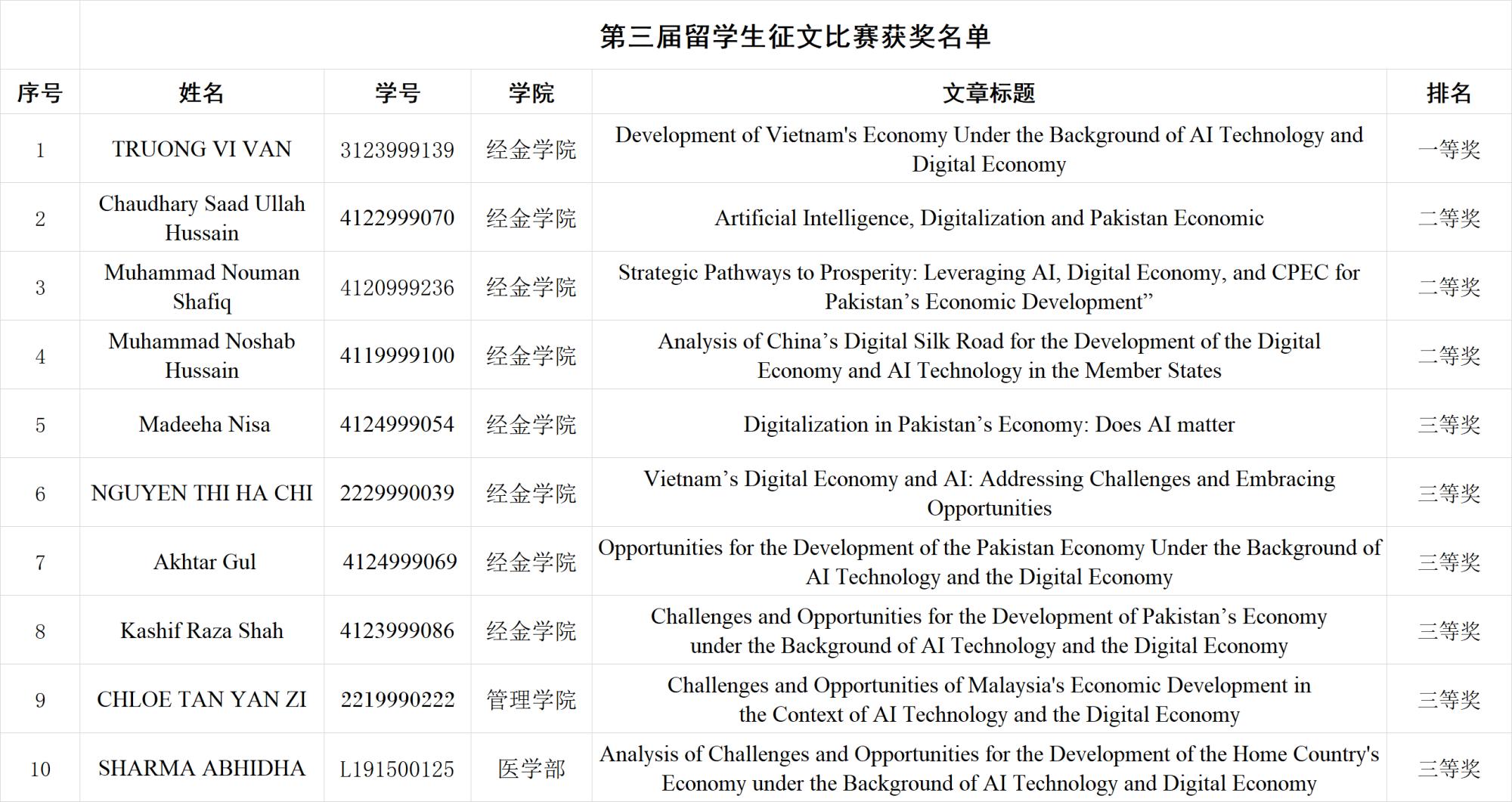 经过评审专家组的细致评阅与独立打分,历时两周的严格评审过程后,“第三届留学生征文比赛”的获奖名单终于揭晓。共有10篇佳作脱颖而出,其中一等奖1篇,二等奖3篇,三等奖6篇(具体获奖名单请见附件)。学院将为获奖同学颁发荣誉证书、精美纪念品以及奖金,以表彰他们的杰出表现。