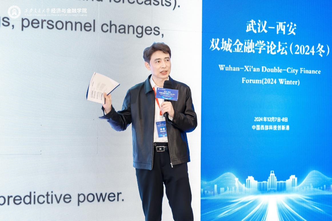 在分论坛四,陕西师范大学国际商学院张嘉望副教授、武汉大学经济与管理学院李斌教授、中南财经政法大学金融学院孙宪明副教授、西安交通大学经济与金融学院马瑶助理教授、西安理工大学经济与管理学院牛逸茖分别做了题为“分支机构扩张、银行竞争与企业新质生产力”“预期管理与金融稳定—基于多模态大数据的视角”“Optional Disclosure and Observational Learning”“Production complementarity, 52-week high, and cross-firm return predictability”“气候政策不确定性对系统性金融风险跨市场传染的影响研究”的学术报告。西安交通大学经济与金融学院马草原教授、《世界经济》编辑部高凌云主任对上述论文进行了点评。分论坛四由西安交通大学经济与金融学院郭品副教授主持。