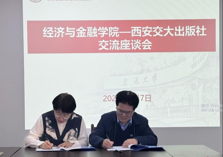 会议最后,双方签署合作协议,正式确立战略合作关系,经济与金融学院与西安交通大学出版社在教材建设方面的合作自此迈出坚实一步。双方表示,未来将持续推进深化合作,共同推动更多高质量教材出版,为培养更多经济金融人才提供有力支撑。