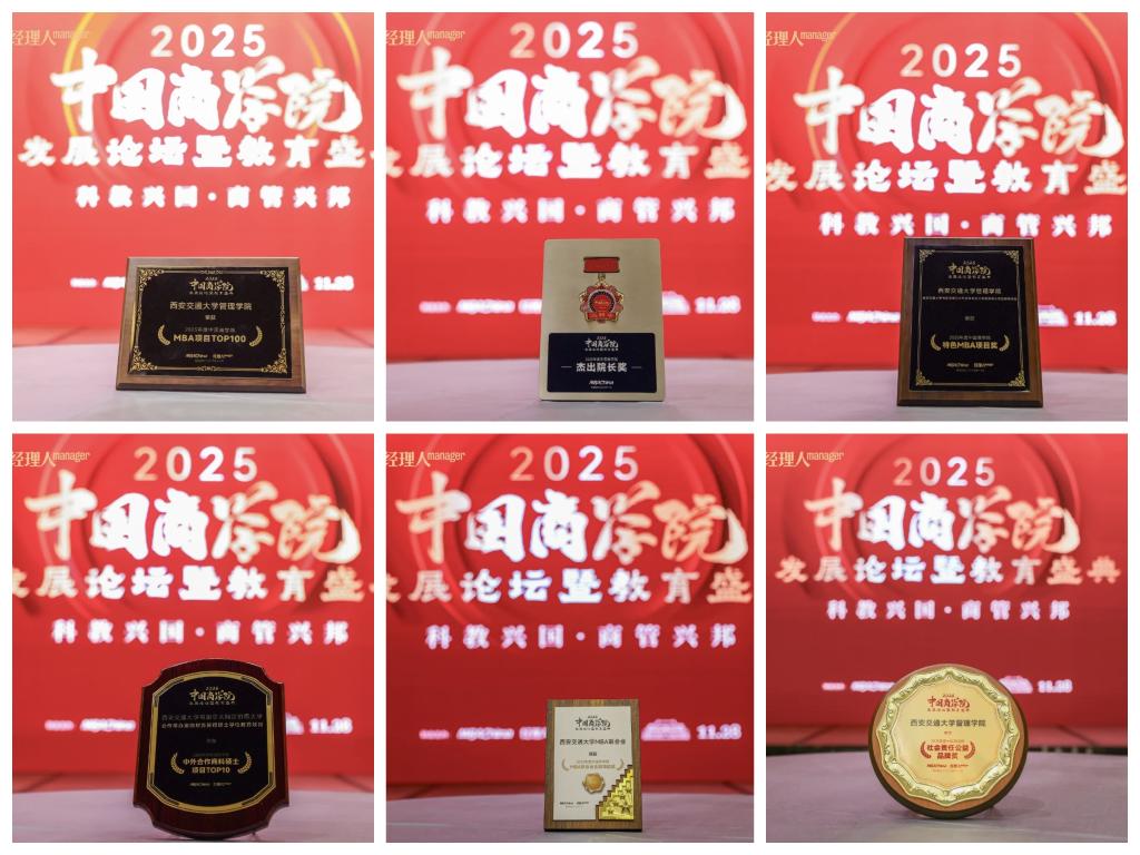 此外,西安交通大学MBA项目在本次盛典中还斩获了“2025年度中国商学院MBA项目TOP100(第8名)”“杰出院长奖”“2025年度中国商学院特色MBA项目”“2025年度中国商学院中外合作商科硕士项目TOP10”“2025年度中国商学院社会责任公益奖”“2025年度中国商学院MBA联合会金徽领航奖”等多项荣誉,展示了西安交通大学在推动MBA教育发展的积极探索与显著成效,彰显了西安交通大学MBA教育的品牌价值与社会认可。