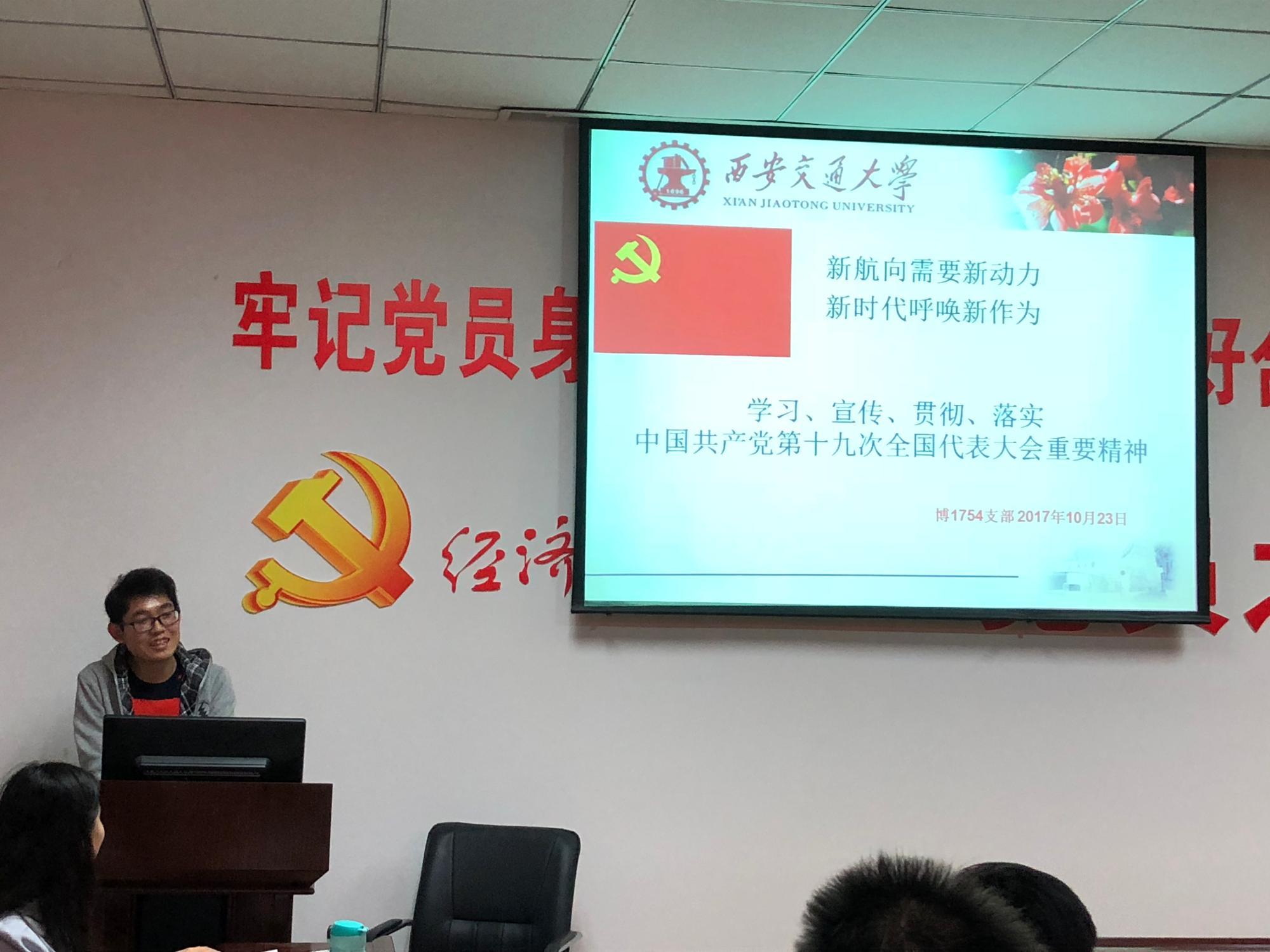 2017年10月23日晚七点,经济与金融学院博1754支部“深入学习、宣传、贯彻、落实中国共产党第十九次全国代表大会精神”研讨会在财经主楼708会议室成功举行,经济与金融学院党委副书记周建伦老师出席。支部全体党员、积极分子针对十九大报告内容进行了深入学习和积极讨论。