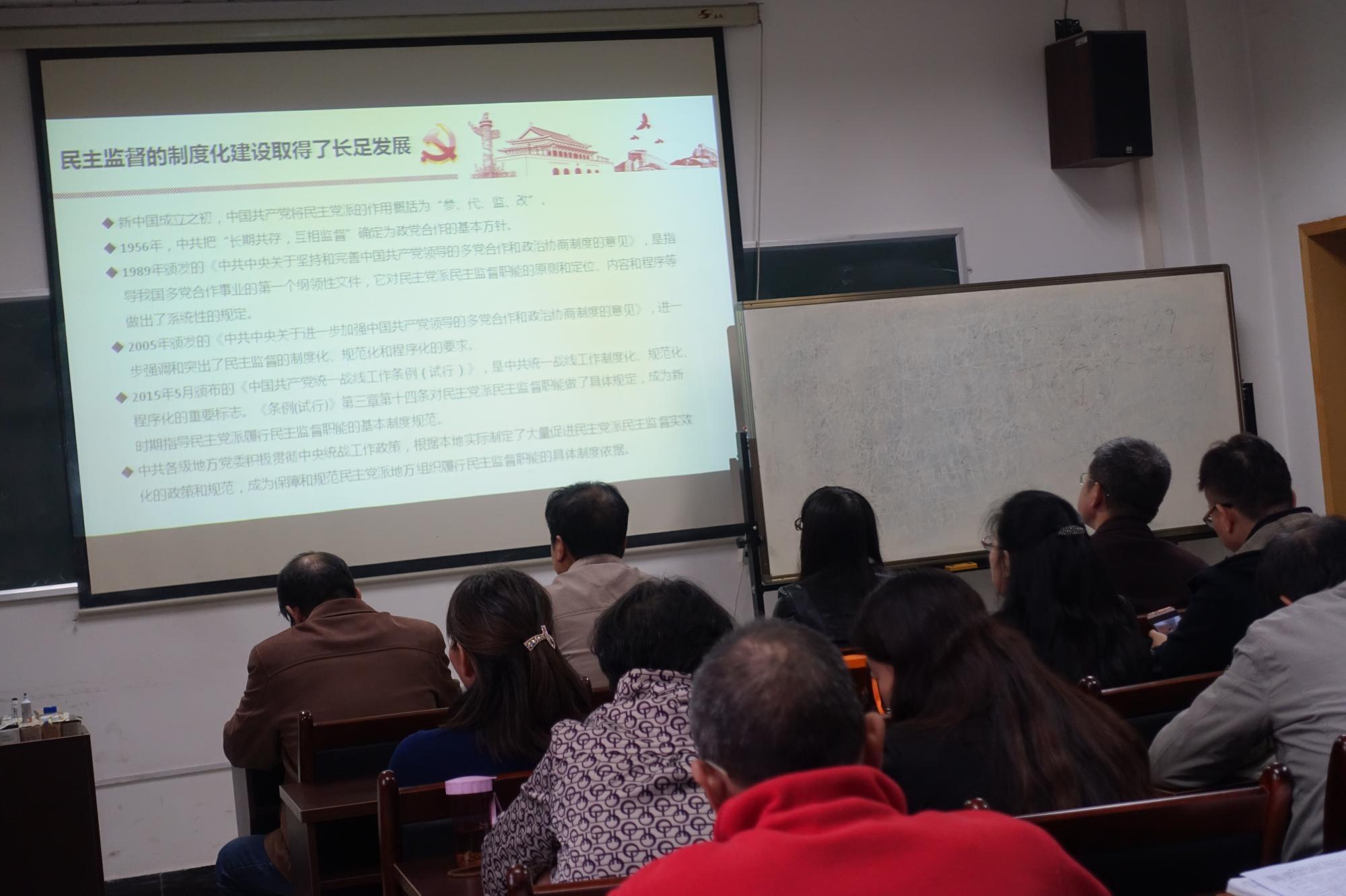 习近平总书记在十九大报告中指出:“坚持长期共存,互相监督,肝胆相照,荣辱与共,支持民主党派按照中国特色社会主义参政党要求更好履行职能。”吴平魁教授以“中国特色政党制度中民主党派的民主监督职能”为主题展开报告。吴教授从民主党派民主监督职能的内涵和原则、履行民主监督职能的现状和问题、强化民主监督职能的建议和对策等几方面联系十九大报告内容,进行了详细地解读。他说,西安交通大学的民主党派包括经金学院的多位担任政协委员的民主党派教师均在积极地履行民主监督职能,支持、维护和帮助共产党更好地执政和加强党的建设。