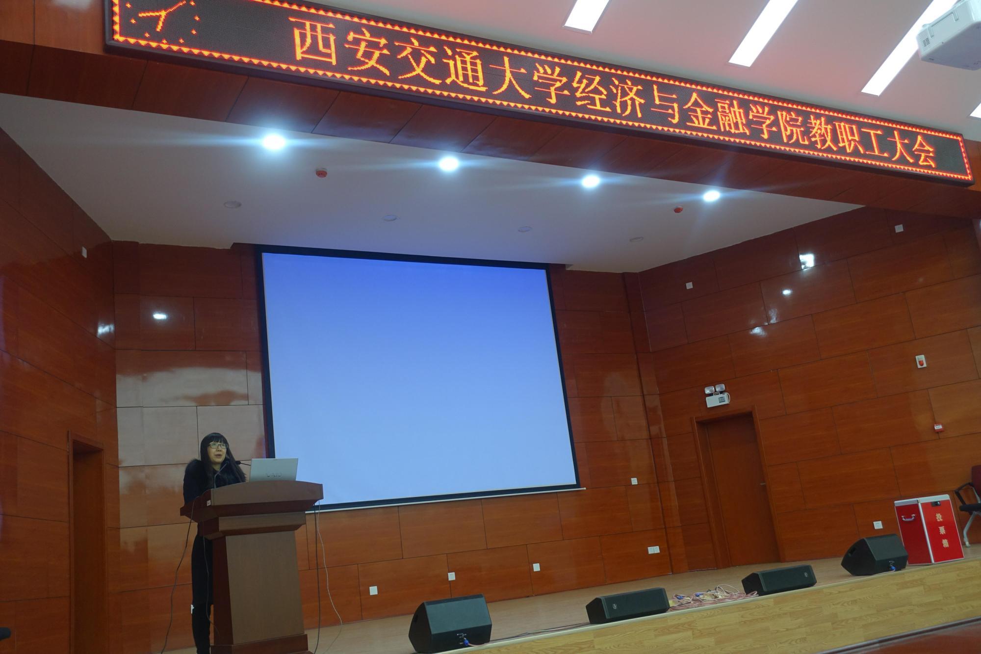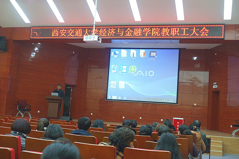 孙早院长首先向大家传达了王树国校长“爱国奋斗,无怨无悔,做好西迁精神新传人;时不我待,只争朝夕,开创学校发展新局面”的主题报告精神。孙早院长按照“2017年学校各项工作、学校2018年重点工作与存在问题分析”三个部分向全院教职工详细解读了王校长的报告。孙早院长进一步结合教育部第四轮学科评估中经金学院应用经济学与理论经济学的位次情况,从师资队伍、人才培养、科学研究以及社会服务方面认真作了对比分析。孙院长还就提出2018年学院重点工作作了部署:(1)认真贯彻落实学校学院2018年目标任务;(2)严格执行各项管理制度,确保各项工作有序进行;(3)对照学科评定结果,找出短板,尽快拿出切实可行的改进措施;(4)出台研究生导师管理条例,加强师德师风建设;(5)科学研究的工作要坚持“两手抓、两手硬”中英文学术论文并举原则,努力提升学院科研水平。孙早院长强调,全院上下一定要将思想认识高度统一到学校“双一流”建设的战略部署上,共同努力开创经金学院发展的新局面。