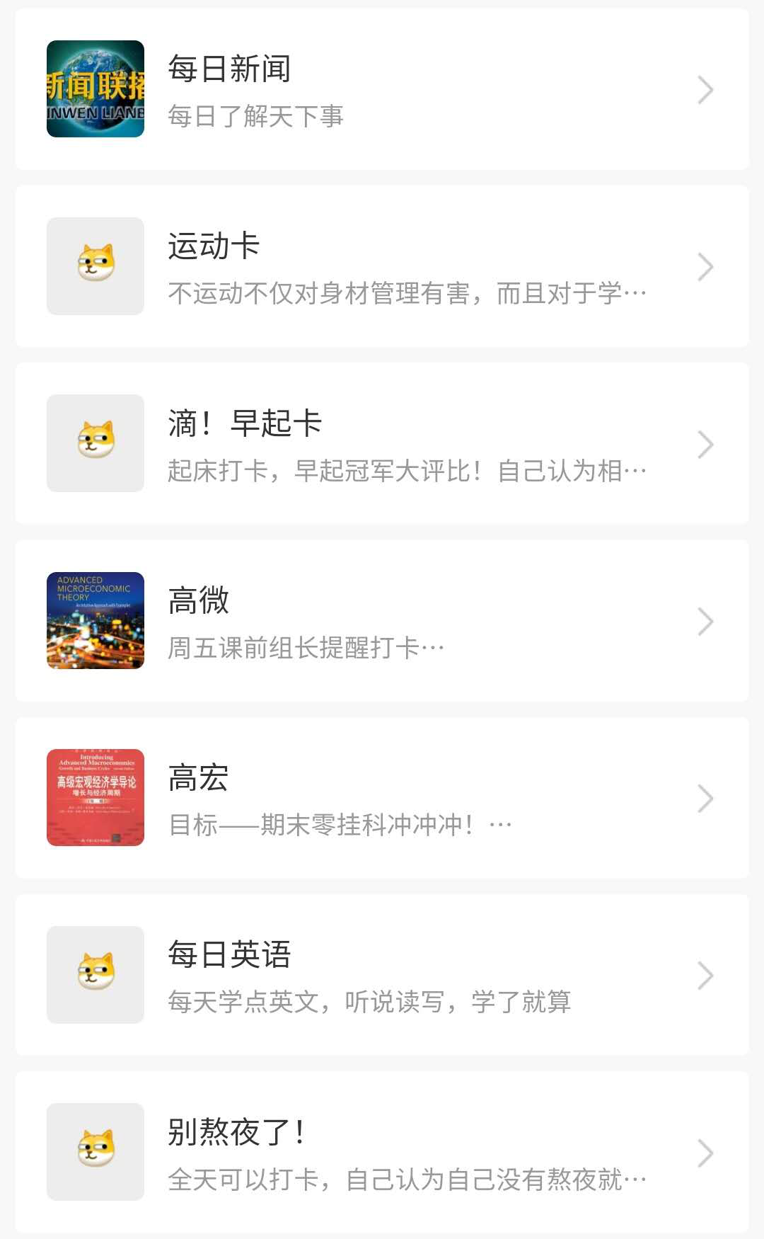 首先是进行活动分组。养成良好的个人习惯归根结底是要靠自身的主观能动性,我们在充分尊重个人主观意愿的基础上,采取自愿的原则,由同学们自发提出想要养成的习惯目标,≥2人即可建立打卡,不设置人数限制,借助于“互动星球”微信小程序建立打卡圈子,一个圈子代表了一个习惯目标,最终形成了如图七个习惯“圈”——