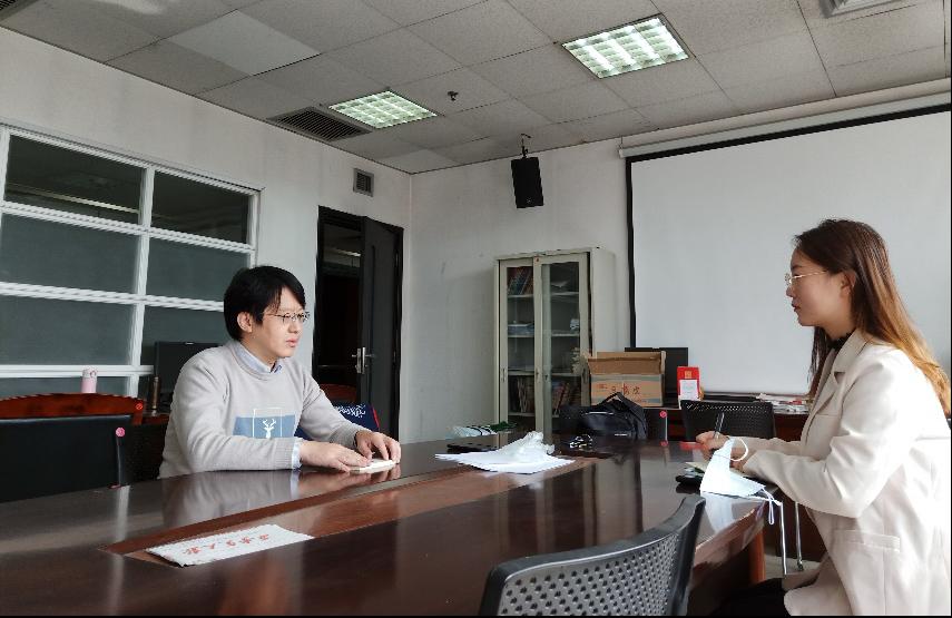 图4:团支部书记杨雅婷(右)采访李明老师(左)
