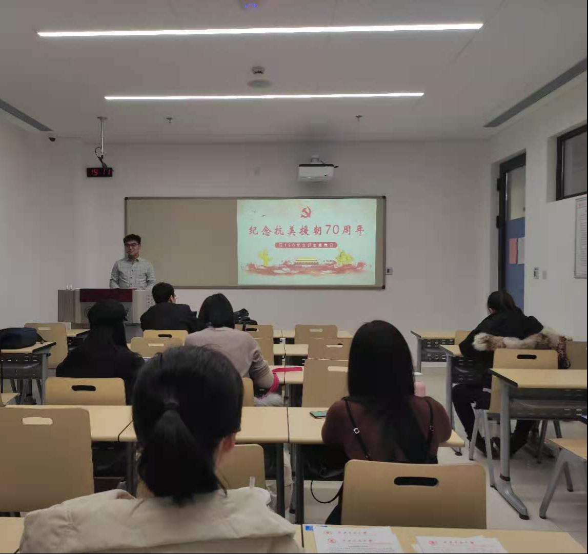 为纪念中国人民志愿军抗美援朝出国作战70周年,学习和弘扬抗美援朝精神,缅怀革命先烈,传承红色文化,2020年12月3日晚上七点,硕0160班党支部全体党员以及支部积极分子在涵英楼2046开展了“纪念抗美援朝70周年”主题党日活动。