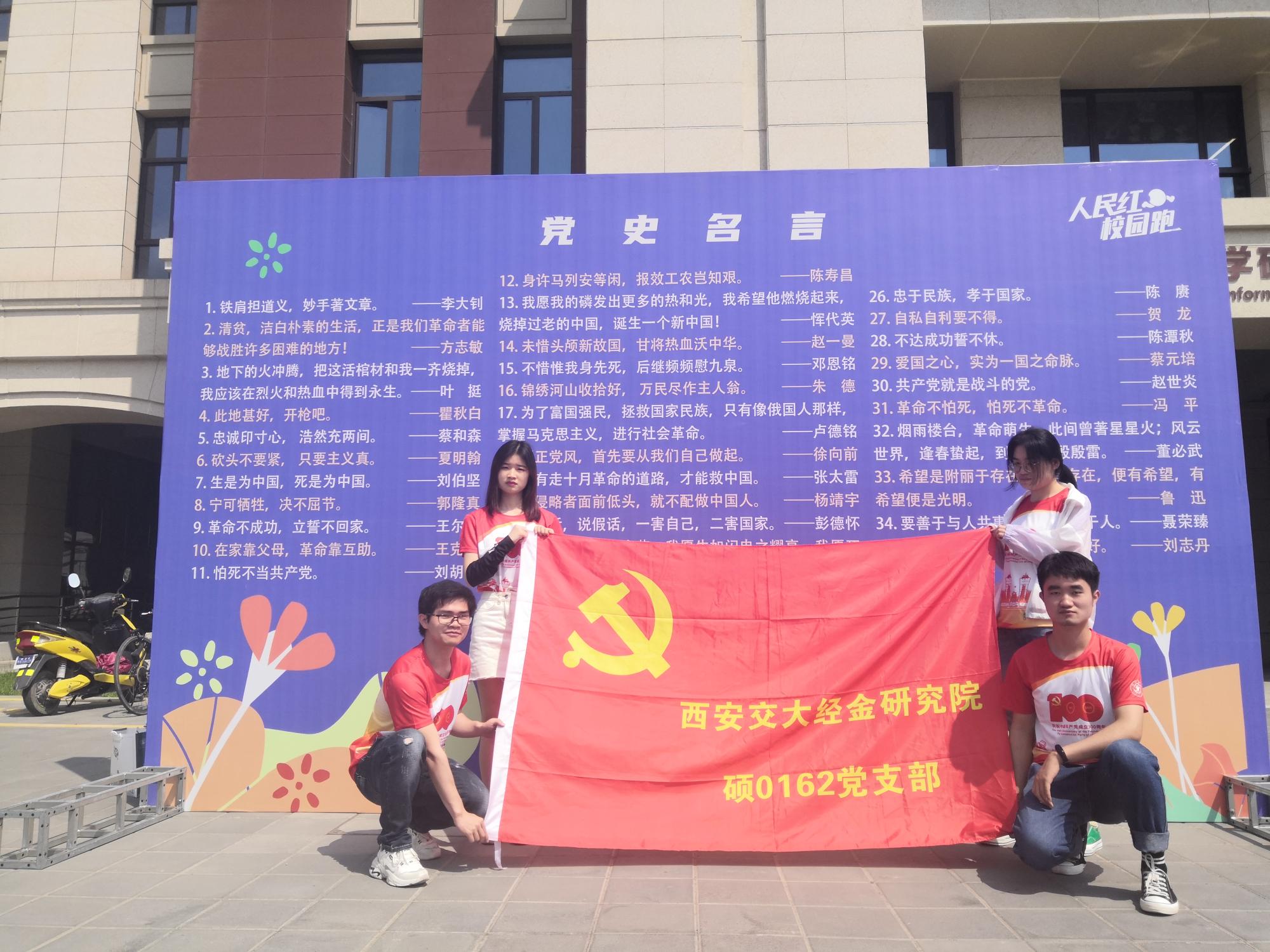 5月22日,“启程吧!人民红”活动走进西安交通大学,“百年追梦,奔向未来”西安交通大学校园红色跑特色活动作为其中的重要一环,不仅表达了交大建校125周年暨迁校65周年以来“听党指挥跟党走,与党和国家、与民族和人民同呼吸、共命运”的深刻思想,还在实践中宣传回顾了我们党百年来走过的光辉历程。为了重温西迁精神和学习党史,为了响应学校及学院党委号召,硕0162党支部成员积极参与到校园红色跑及志愿服务工作中。
