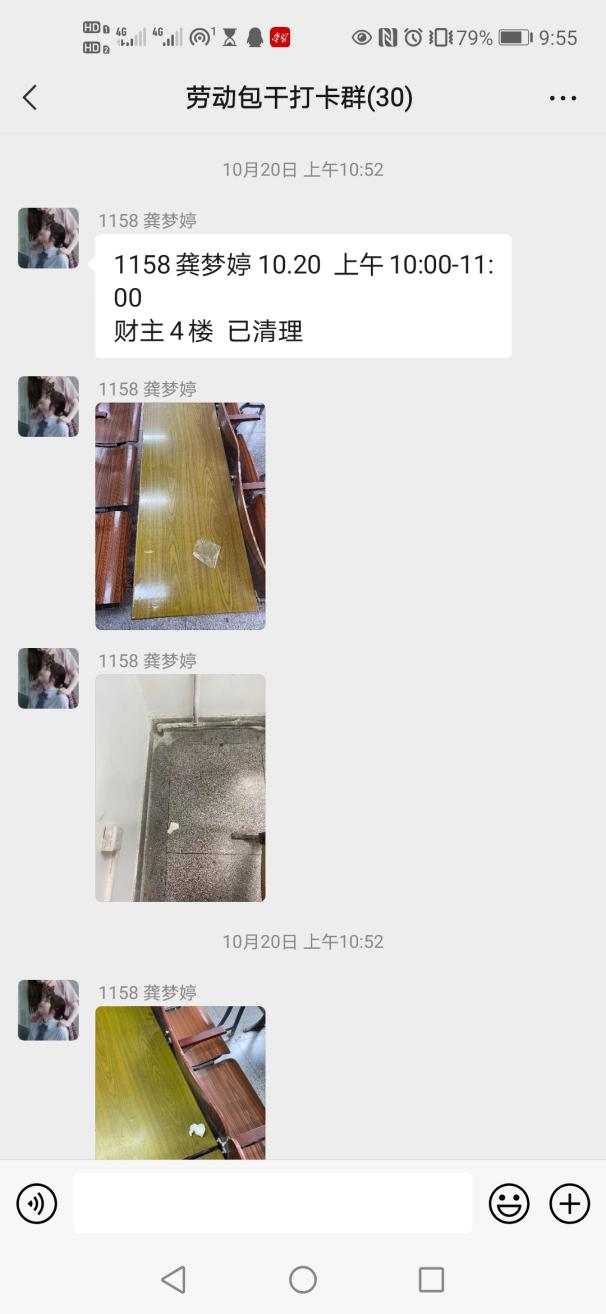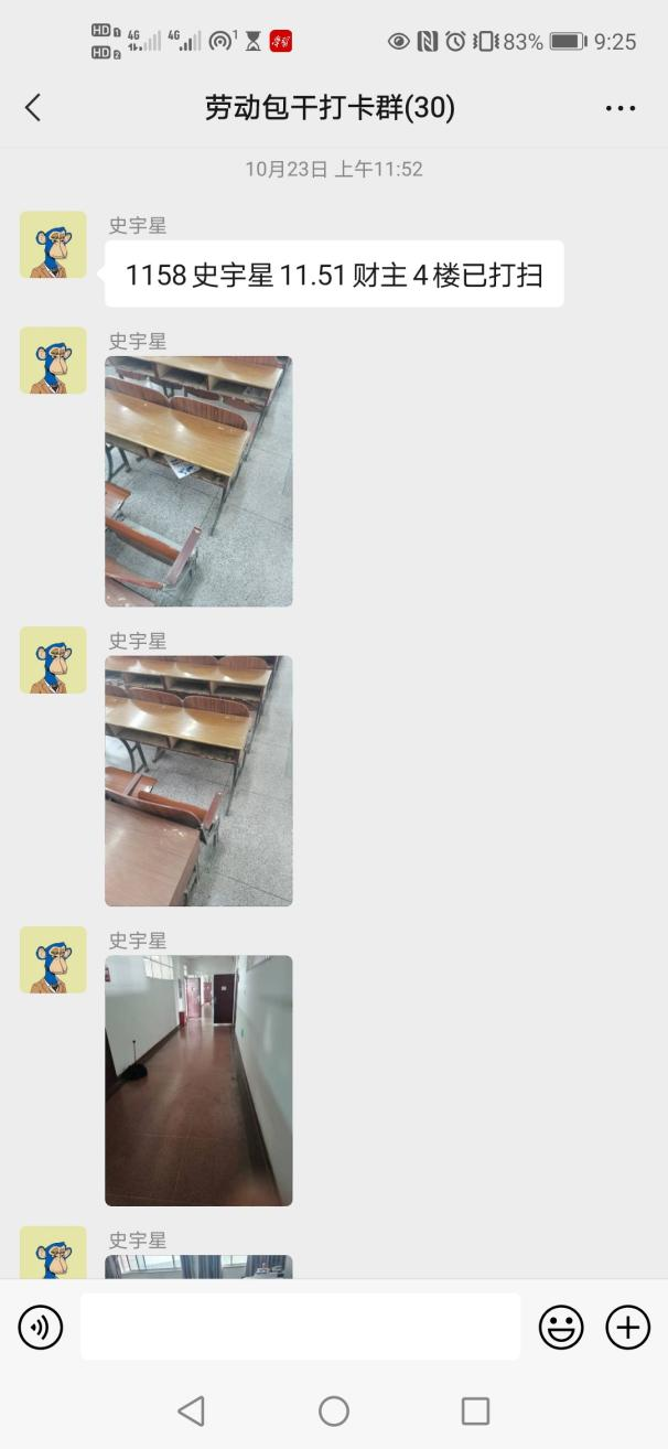 根据会议安排,劳动包干组主要负责财经主楼四层公共区域及教室环境卫生,硕1158班安排14位同学进行,每7人为一个小组,各小组轮流负责一周,每日安排一位同学为总负责人,负责在群内打卡汇报并说明该小组成员所负责区域环境卫生情况。同学们都十分热情,积极报名参加并在劳动打卡群留下了认真工作的记录。
