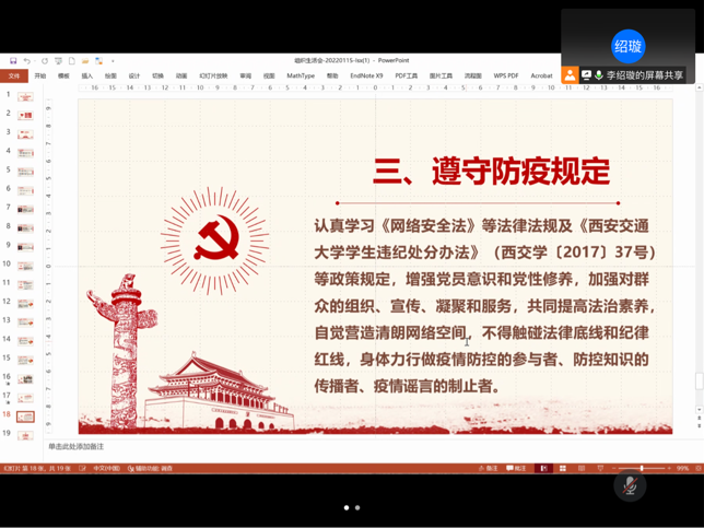 本次组织生活会最后一项由支部书记刘帅同志带领大家学习《网络安全法》等法律法规及《西安交通大学学生违纪处分办法》等政策规定,增强支部成员的党员意识和党性修养,号召大家做疫情防控的参与者、防控知识的传播者、疫情谣言的制止者。