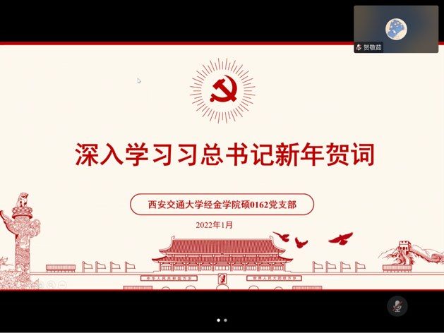 2021年12月31日,习近平主席第九次发表新年贺词。其中一句“民之所忧,我必念之;民之所盼,我必行之”,短短16个字感动了亿万人民。为深入学习贯彻习近平主席2022年新年贺词精神,硕0162党支部于1月15日晚通过腾讯会议线上开展了“聆听新年贺词,感受总书记情怀”为专题的组织生活会。