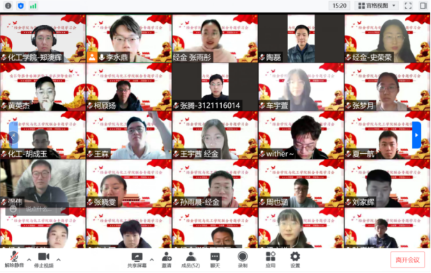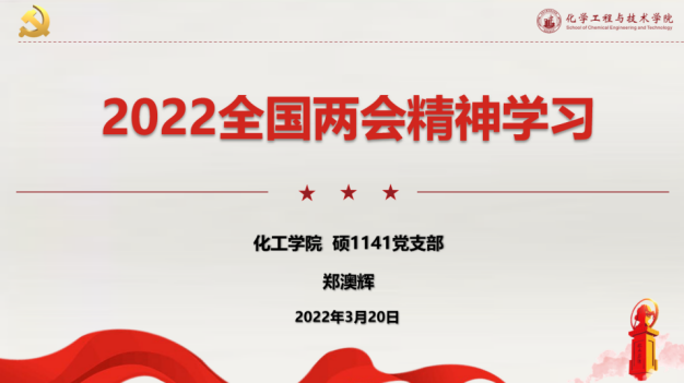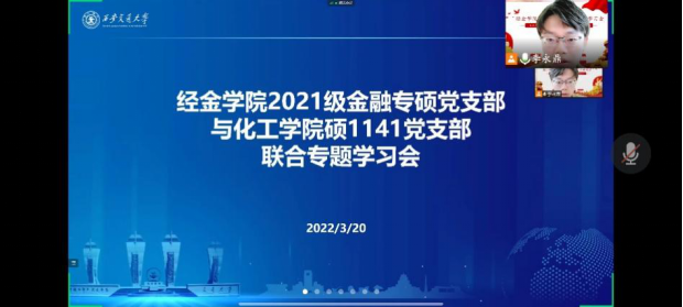 近日,适逢十三届全国人大五次会议和全国政协十三届五次会议胜利闭幕之时,《中共西安交通大学委员会西安交通大学2022年工作要点》正式发布。“两会”热点问题和学校工作要点成为同学们关注的焦点问题。为深入学习“两会”精神及学校2022年工作要点,经金学院2021级金融专硕党支部与化工学院硕1141党支部联合开展支部专题学习会。会议由经金学院2021级金融专硕党支部书记李永鼎主持。经金学院副书记周建伦、化工学院副书记陶磊、化工学院辅导员强伟列席指导。