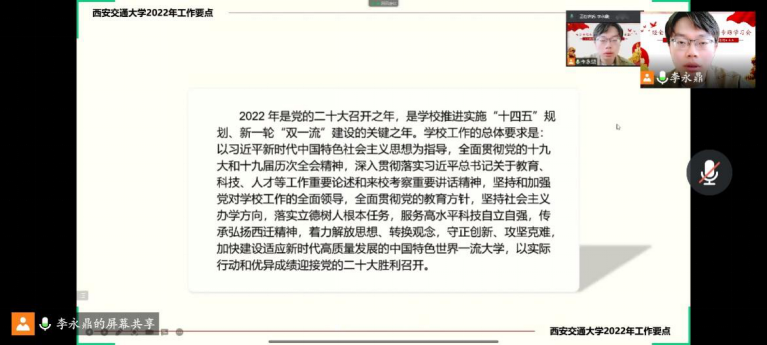 随后,李永鼎带领大家学习《中共西安交通大学委员会西安交通大学2022年工作要点》。他分别从坚持用习近平新时代中国特色社会主义思想铸魂育人、完善德智体美劳全面培养的育人体系、支撑高水平科技自立自强等十个方面,介绍了二十六个具体工作要点。基于以上分享,他呼吁同学们作为交大一员,除了重视科研学习,还应当放宽视野、提高站位,时刻关注学校发展。
