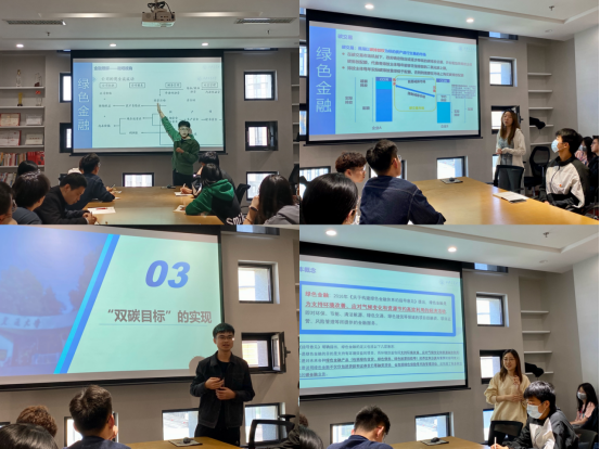 经金学院胡健、艾乐、付昭和王宇茜分别从绿色金融、碳交易市场、绿色金融工具和陕西绿色金融现状四个方面介绍与碳达峰、碳中和相关的金融知识,提出“产业为本,金融助推”理念,以“绿色”作为产业之本,做好资金的融通,保障现金流的稳定,使金融更好地为实体产业服务,促进经济增长,以达到“双碳”目标的实现。