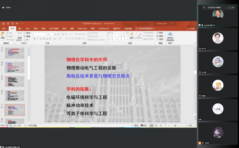 电气学院孙启明同学则从跨学科角度介绍了高电压学科的内涵与基本情况,并分别介绍其实践性、经验性的学科特点,真、实、直、率的学科培养特点,从另一学科领域的交流互动,激发学生担当科技报国使命的青春热忱。