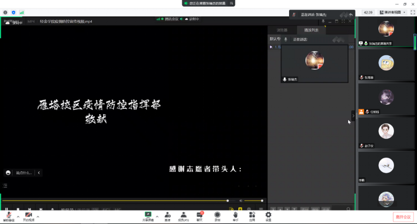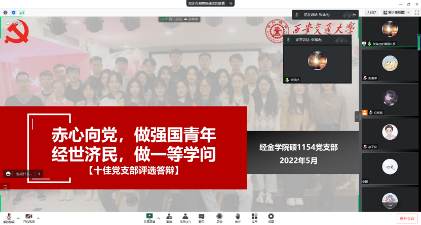 经金学院研究生会主席、硕1154党支部书记张瑞杰做主题分享,通过回顾他的学生工作经历,介绍在迎新活动、班级管理等方面的工作,从个人层面展现榜样青年的风采。接着他以“一个主题、两个路线、三个目标、四个阵地、五个小组”为主线,分享所在集体的党团班高效协作的经验教训,从基层党团建设角度展现先进集体的事迹。最后张瑞杰以视频的方式分享疫情封控期间的点滴,从招募志愿者、组建志愿先锋队、到物资的协调与搬运,充分展示出一位优秀党员忠于职守、共渡难关的心路历程。他表示,站在新时代、新起点,希望各位学子要时刻铭记来时的路,不忘初心、坚定信念,成为有担当、有理想、有情怀的新时代青年。