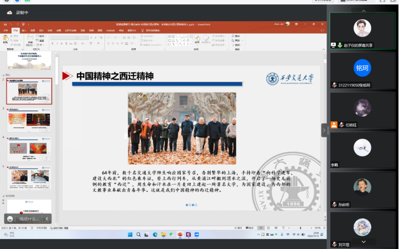 硕2065党支部书记、校团委团建中心副主任赵子仪从他在共青团基层建设方面和学联学生会组织中的工作经历和感悟出发,介绍了他在团的工作中赓续红色血脉的成长经历。随后赵子仪结合研究生支教团临时团支部的建设情况,分享思想政治建设、团队制度建设、助力全面发展、组织实践活动、创新组织机制的先进经验,生动展示他在支教生活中发扬前人精神、不断实践探索的动人篇章;最后以党的精神谱系为主线,分别介绍了中国共产党的革命精神、艰苦创业精神、改革开放精神和新时代伟大奋斗精神。同时,他以“西迁精神”为重点,详细阐述其历史内涵、精神内核与现实意义,领学习近平总书记考察西安交通大学的重要讲话,并通过现实事例生动展示“‘西迁精神’薪火传”的深远意义。